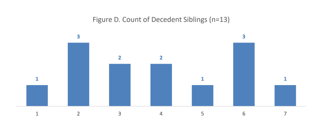 The children who died disproportionately resided in Ward 8 (seven children), Ward 7 (four children), Ward 5 (one child), and Maryland (one child). All of the children who died were African-American. None of these facts are surprising since they reflect the demographics of CFSA’s clients. Most of the children were living at home at the time of the fatality, except two that were living with relatives. All of the children who died had siblings. Nine of the decedents (about 69 percent) had three or more siblings; seven (54 percent) of them had four or more siblings, and four had six or more siblings. Many of the siblings were half-siblings. Twelve of the 13 decedents had at least one-half sibling.
