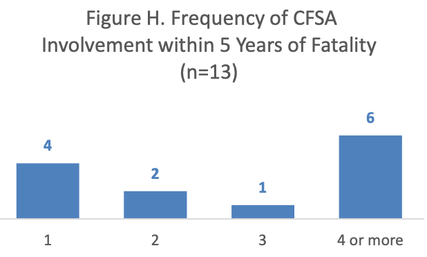 Over three quarters of the decedent’s families (10 families) had an open case or investigation within five years of the fatality. The other three families had one or more screened-out referrals only.