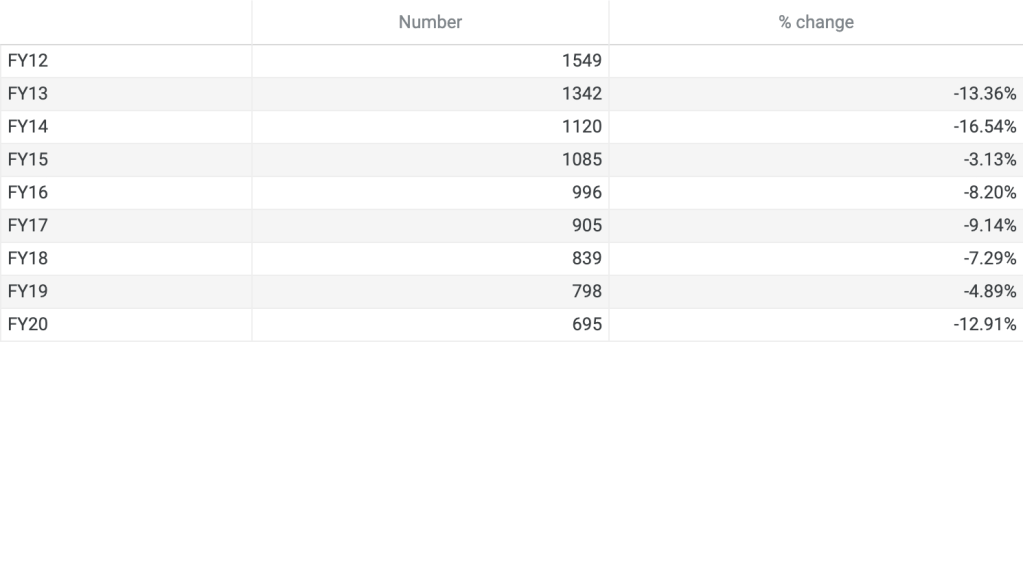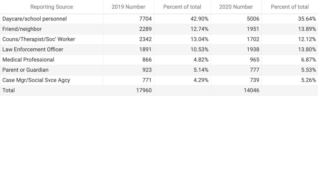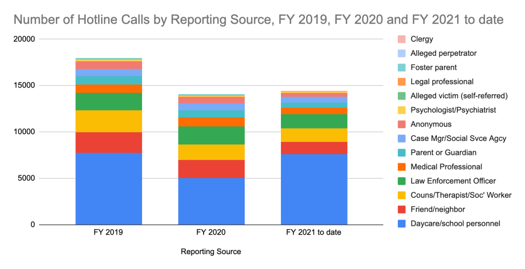 Comparing the months across years shows that in January and February 2020, before the pandemic shutdown began, there were actually more hotline calls than there were in the same months of 2019, suggesting that the year would have seen increased reports if not for the pandemic. But in every month of the pandemic, the number of hotline calls in 2020 was considerably less than its counterpart in 2019. (The actual numbers are provided in Table 2 at the bottom of this post.) The biggest year-to-year differences were in April and May 2020, after the pandemic emergency began, when calls were down by 64 percent and 67 percent respectively over the same months in the previous year. In July and August, the differences between 2019 and 2020 were less drastic, which is to be expected because schools are normally closed during the summer months. But still reports were down by nearly a quarter in both July and August 2020 from the previous year. The total number of hotline calls received between March and September (roughly the period affected by covid-19) fell from 14,245 in 2019 to 9,780 in FY 2020, a decrease of 31 percent.