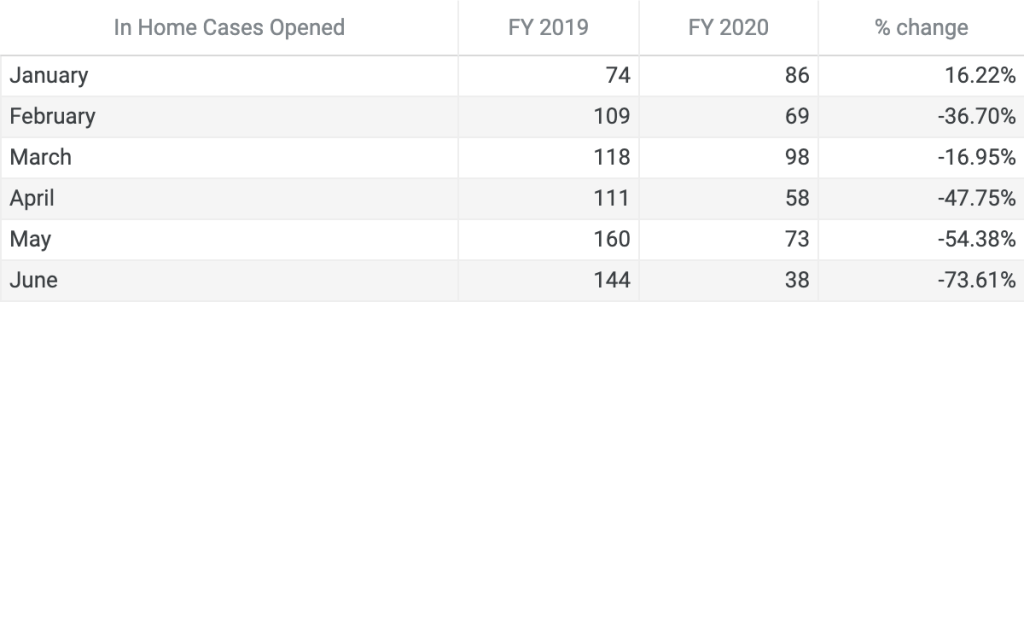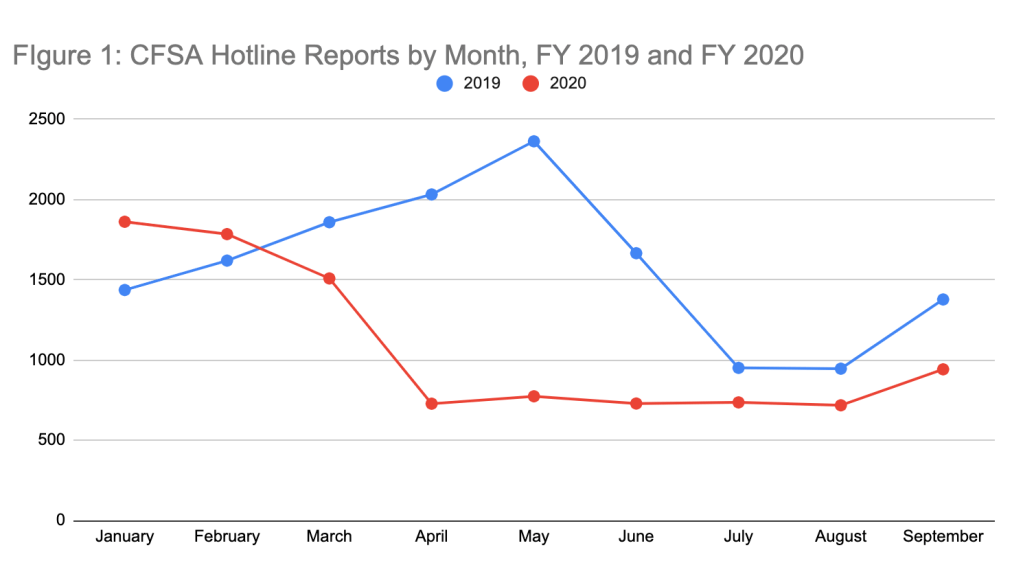 In the District, Mayor Muriel Bowser declared a public health emergency on March 11, 2020 and schools closed for in-person classes on March 13. After a two-week spring break, online learning began on March 24 and the stay-at-home order went into effect on April 1. Online learning ended on May 29, nearly a month early, and the same day that the District entered Phase One of reopening. Schools started on a virtual basis again on August 31. In its public-facing Dashboard, CFSA posts data for each quarter 45 days after the quarter ended. The data for the July through September quarter were posted on November 13, 2020. Using this data, we compared the numbers of reports, investigations, dispositions, in-home case openings and foster care placements since the pandemic with the numbers during the same months of 2019.