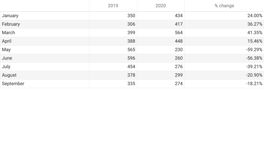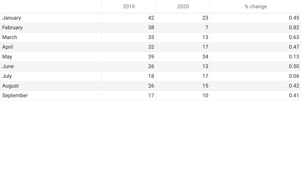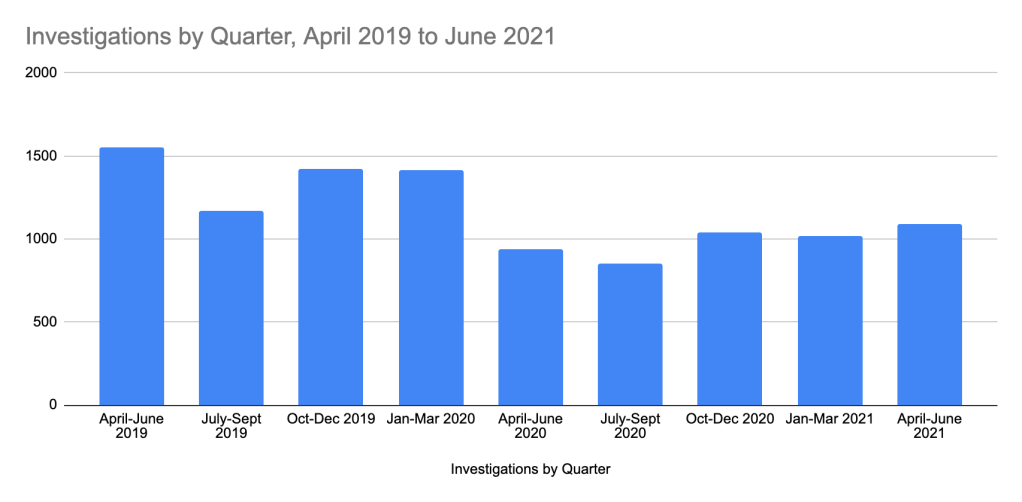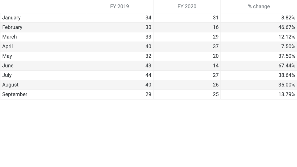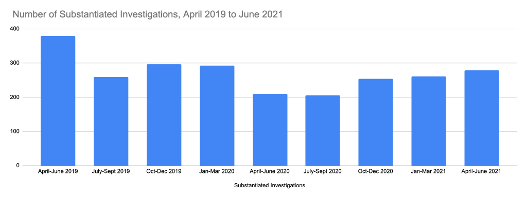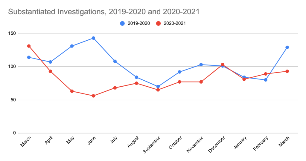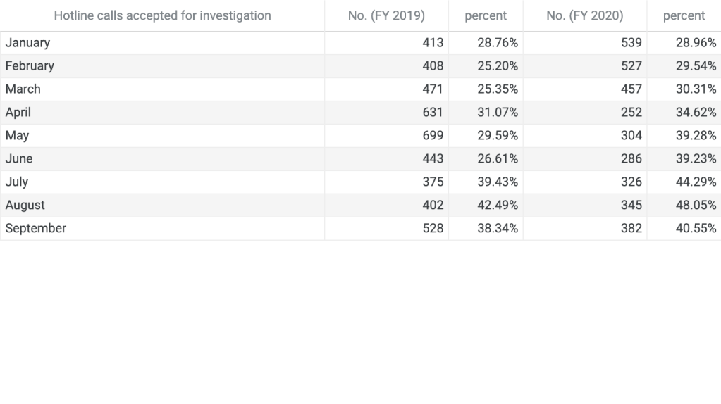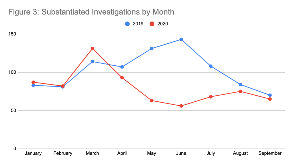 Turning to the numbers, in the pre–pandemic months of January and February 2020, the number of investigations was 24 percent and 36 percent higher than it was in January and February 2019. (Table 2 below the text shows the numbers and percentage changes.) It appears that the agency was on track to have more reports and investigations in 2020 than in 2019, if not for the pandemic. Completed investigations fell in April but it is not until May that the number of investigations completed in FY 2020 dropped below that of FY 2019. Once the number of investigations began to fall, however, it dropped like a stone. In May, only 230 investigations were completed compared to 565 in 2019–a drop of 59 percent. There were 56 percent fewer investigations completed in June 2020 than in June 2019. The gap between FY 2019 and FY 2020 lessened in July but was still large at 39 percent, reflecting the fact that many of these investigations would have begun in the first half of June, when school was still in session in 2019 but not 2020. It was only in August and September that the year-to-year difference declined to 21 percent and 18 percent respectively, reflecting the time lag between reports and completed investigations. It is worth noting that the year-to-year difference was still significant even in those months. This presumably reflects the continuing suppression of hotline reports during the summer of the pandemic. The total number of investigations completed between April and September (roughly the period affected by covid-19) fell from 2,716 in 2019 to 1,787 in FY 2020. That was a decrease of 25 percent–somewhat less than the difference in reports, reflecting the fact that a higher fraction of reports was investigated in 2020.
