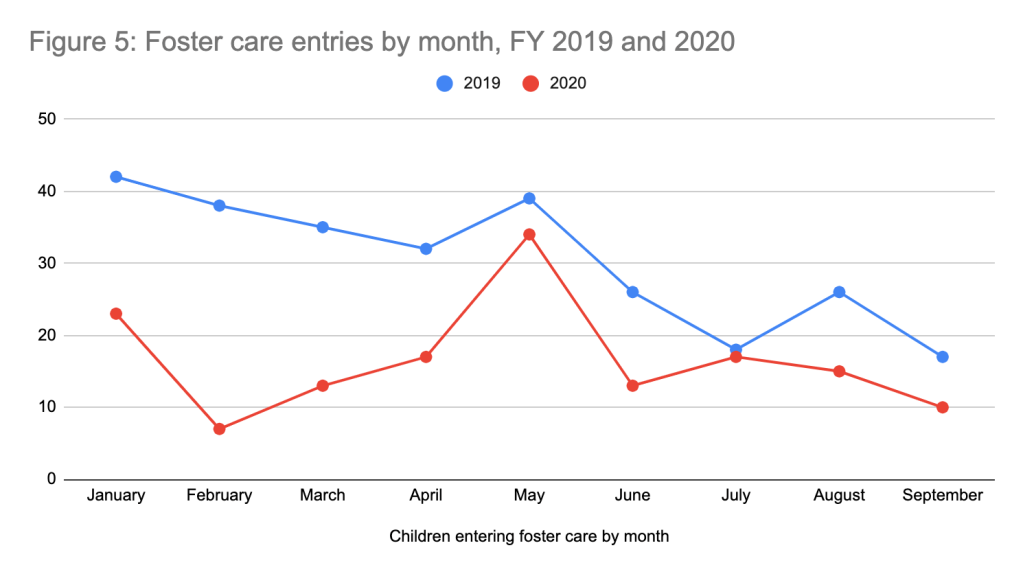 But the big decrease in foster care entries appears to have occurred before the onset of the pandemic, as Figure 6 shows. The number of entries into foster care was falling throughout FY 2019, aside from slight rises in May and August. There was actually somewhat of a rebound in the spring pandemic quarter, while the summer quarter entries fell back to the January-March levels.
