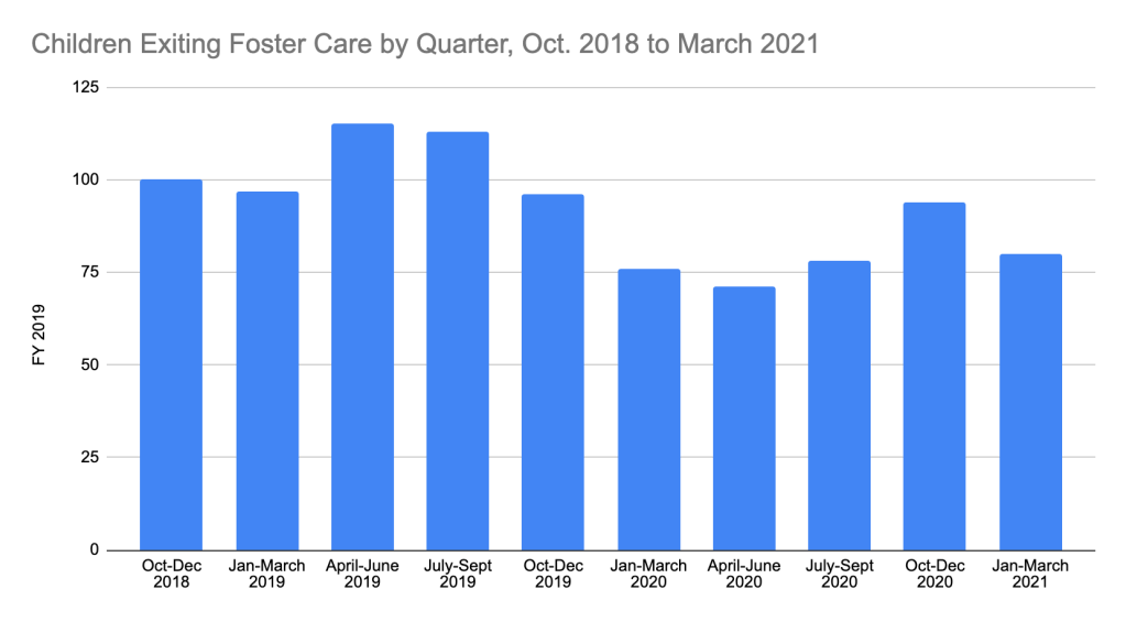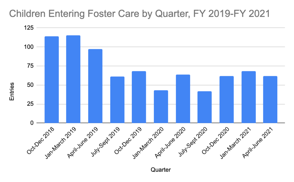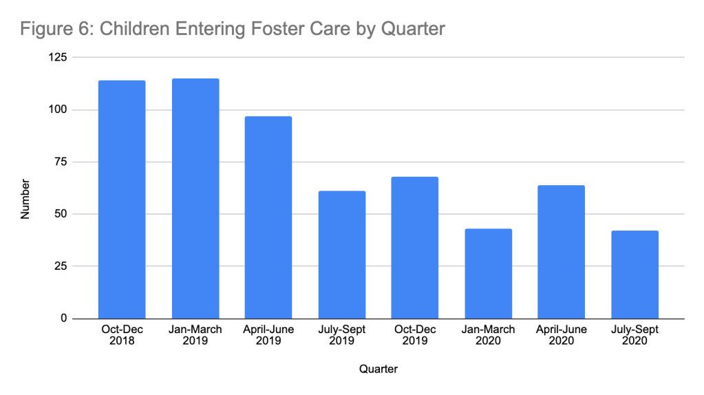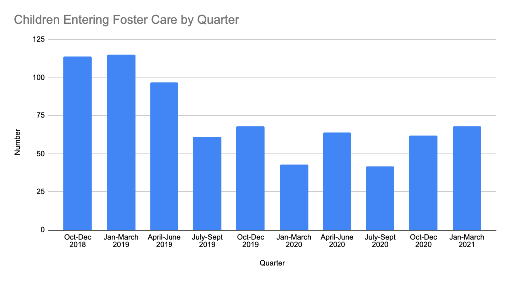 During the four quarters approximately corresponding to the pandemic, there were 236 entries into foster care and 324 exits. As a result of the surplus of exits over entries, the total number of children in foster care declined from 737 in March 2020 to 648 in March 2020, which was a decline of 12 percent–similar to the 13 percent that we found occurred between September 2019 and September 2020. This is a continuation of a multiyear decrease in foster care caseloads. However, we did note in earlier testimony that the percentage drop in the number of children in foster care was greater in FY 2020 than in any other year since FY 2014. So the decline in the foster care rolls seems to be accelerating.