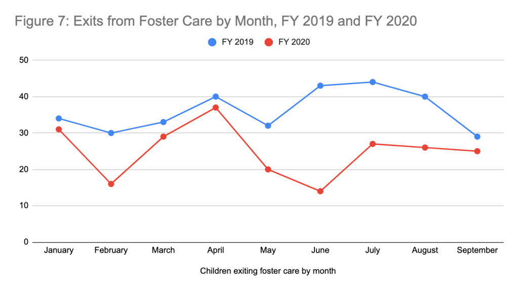 Commentators around the country have expressed concern that covid-19 would create delays in the achievement of permanency for foster youth. Family reunifications could be delayed by court closures, cancellation of in-person parent-child visits and increased difficulty facing parents needing to complete services in order to reunify with their children. Court delays could also hamper exits from foster care due to adoption and guardianship. The monthly data in Figure 7 show that fewer children did exit foster care every month from March to September, especially in May and June, than in the same months in 2019. The difference between years declined in July and August and almost disappeared by September, so perhaps the agency and court were able to clear the backlog. The total number of children exiting foster care declined from 261 during the period from March through September 2019 to 178 in the same months of 2020, a difference of 83 children or 32 percent. A small part of the reduction is due to the City Council’s decision to allow older youth to stay in foster care instead of aging out during pandemic. There were 27 exits by emancipation in the third and fourth quarters of FY 2019 and only 10 in the second half of FY 2020. But this difference does not account for most of the drop in foster care exits during the pandemic period.