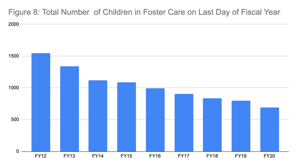 Figure 8 shows the trends in total foster care caseload over time, which reflects both entries and exits. The total number of children in foster care on the last day of Fiscal Year 2020 was 695, compared to 798 on September 30, 2019, for a decrease of 13 percent. This reflects a total of 217 entries and 321 exits during the year. [1] (The percentage declines are listed in Table 7 at the bottom of this post). Combining Dashboard data with previously published data shows that the number of children in foster care on the last day of the fiscal year has declined every year since FY 2012. However, the 13 percent fall during 2020 was greater than in any other year since FY 2014. It appears that this decline happened mostly before the pandemic. Comparing data from March to September of 2019 and 2020 shows that 74 fewer children entered foster care and 68 fewer children exited it, suggesting that the pandemic had little effect on the total foster care caseload.