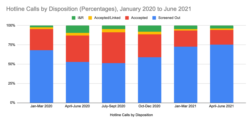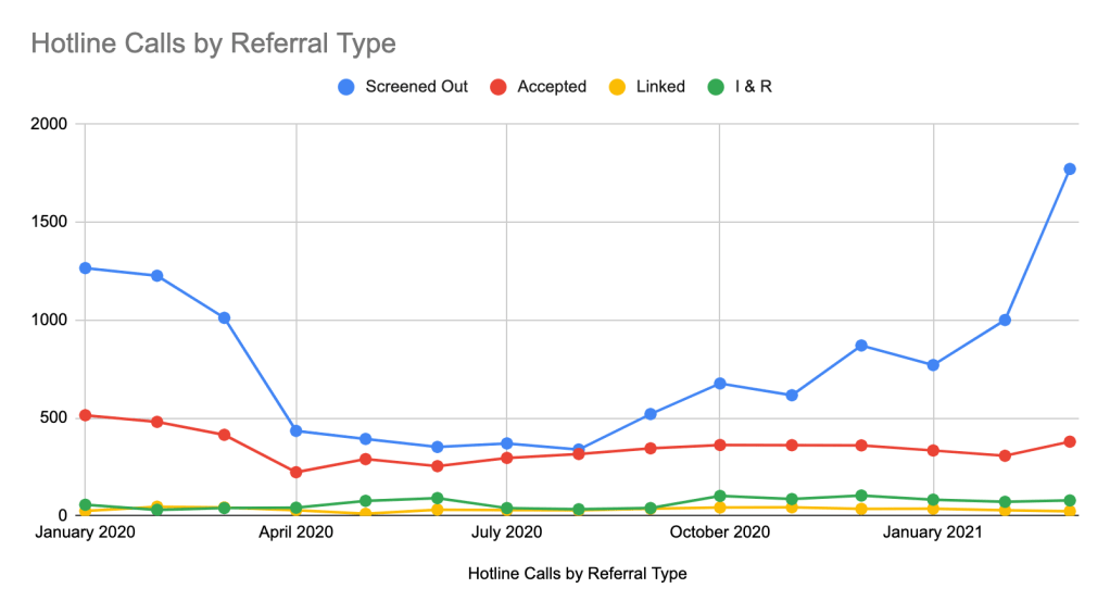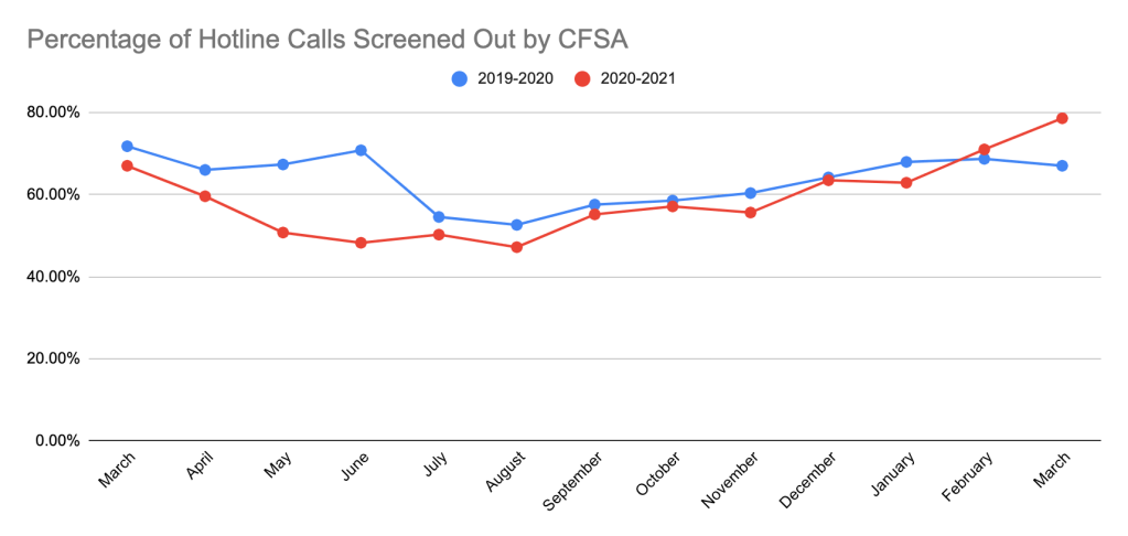 Figure Five shows that with the rapid drop in referrals due to the pandemic, CFSA began accepting a higher percentage of those referrals starting from May to August 2020. But starting in September 2020, as CFSA began getting more calls, screeners began screening out a higher percentage and accepting a lower percentage or referrals. This trend accelerated in February and March of 2021 with the increase in calls to the hotline. This is particularly notable in March 2021, when the number of calls to the hotline jumped from to 2233 from 1408 the previous month. Confronted with this onslaught of new calls, CFSA increased the percentage screened out from 62.9 percent in January 2021 to 71.1 in February to 78.6 percent in March.