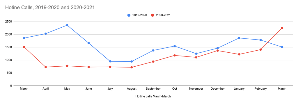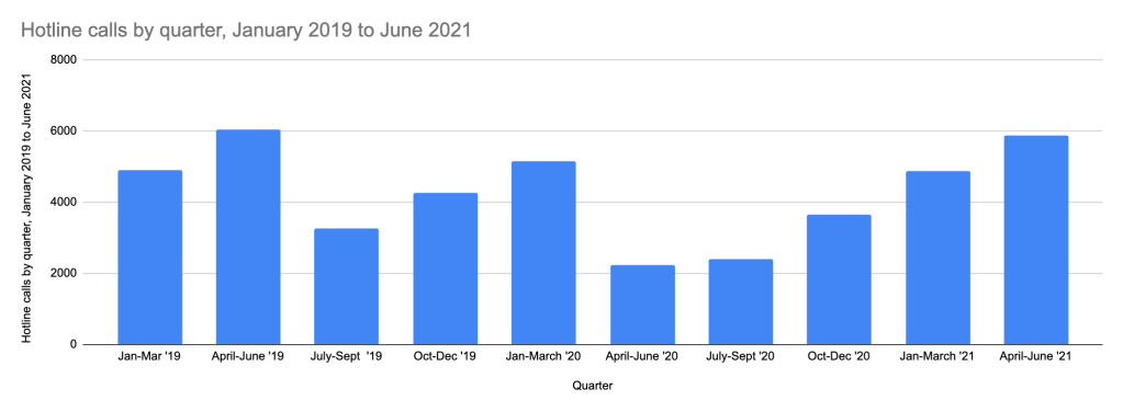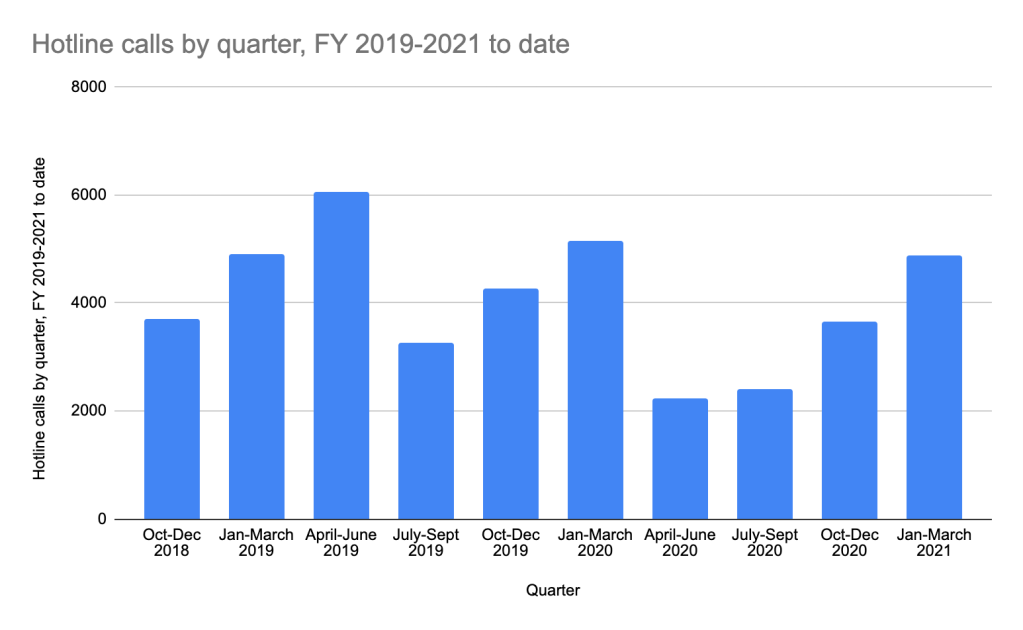 The number of hotline calls per quarter is shown in Figure Two. This quarterly view shows how referrals plunged in the first full pandemic quarter (April-June 2020) and have increased in each quarter since then. The total number of referrals fell from 18,751 in the four quarters ending March 2020 to 13,172 in the four quarters ending March 31, 2021.