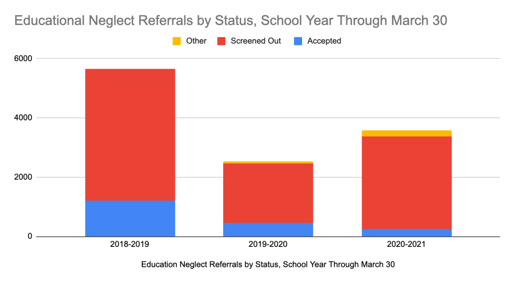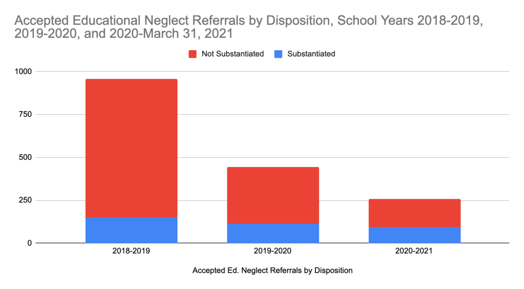 This decline in acceptance of referrals is not surprising because CFSA, citing an influx of referrals in the fourth quarter of previous years, made a conscious effort to reduce calls by telling educators that unnecessary calls would be screened out, as described in our previous post, CFSA, DCPS and the safety of children not in school buildings. CFSA’s increased tendency to screen out referrals is somewhat concerning, especially combined with the strong discouragement of referrals in their most recent guidance. Data provided by CFSA in response to a request from Councilmember Nadeau, shown in Figure Five, shows there is reason for concern. (Because the data provided for School Year 2020-2021 extended only through March 30, we requested data for the same period of the two previous years for comparability purposes, and these are the periods covered by the figures below). The number of educational neglect referrals fell from 3,368 in the first three quarters of the pre-pandemic school year of 2018-2019 to 2,378 during the same three quarters of School Year 2019-2020. This is rather confusing since Covid-19 did not shutter schools until March. In the current academic year through March 30, 2021, educational neglect referrals came roaring back. CFSA had already received 3,581 educational neglect referrals as of March 31–more than in the full pre-pandemic year. But the number of accepted educational neglect referrals declined from 956 in SY 2018-2019 to 443 in SY 2019-2020 to 258 in the current school year through March 31.