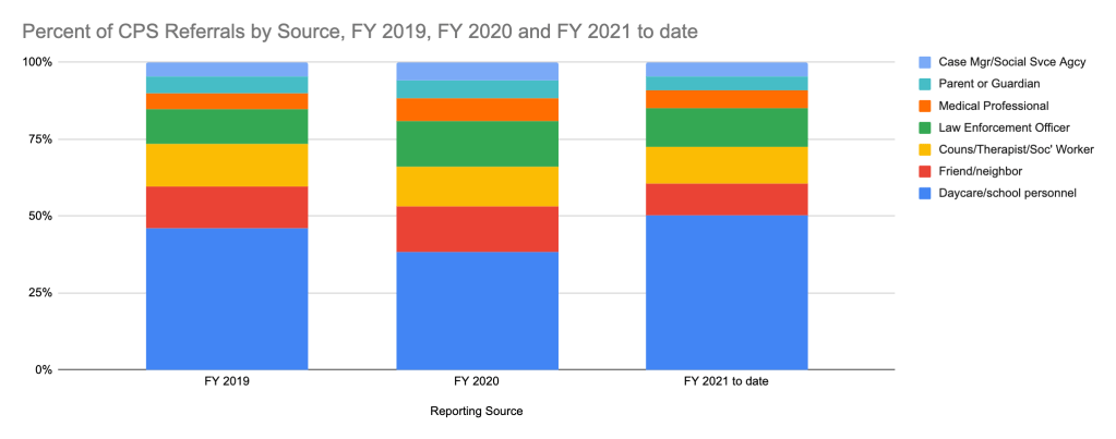 While monthly data on reporting source are not available, annual data for FY 2020 shown in Figure Three suggest that a decline in reports from school personnel was a major factor behind the fall in referrals overall. In FY 2019, school and childcare personnel made 42.9 percent of all calls to the hotline, but this percentage went down to 35 percent in the pandemic year of 2020. But in FY 2021 to date the percentage of calls that come from teachers actually increased to 47.7 percent–which is higher than the pre-pandemic share of 42.9 percent in FY 2019. This change reflects the big increase in referrals from schools in March, after some children returned to school.