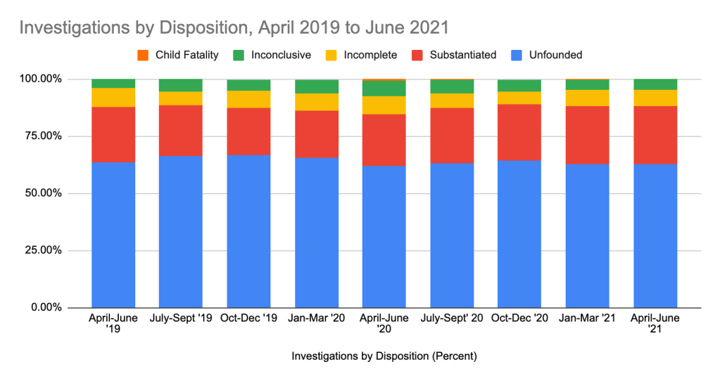 An investigation can have several possible results. It can result in a finding of “inconclusive,” meaning the evidence is insufficient to prove maltreatment despite some indications it occurred; “unfounded,” which means “there was not sufficient evidence to conclude or suspect child maltreatment has occurred” “substantiated,” indicating that the evidence supports the allegation of maltreatment; “incomplete” (as defined in the CFSA Data Dashboard), or “child fatality,” which is defined as a “suspicious death of a child that may be due to abuse or neglect.”
