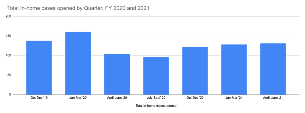 There were 477 in-home cases opened and a very similar 457 closed in the four quarters ending June 30, 2021, which suggests that the number of open cases changed little over the period. The number of families with in-home cases indeed changed little from June 30 2020 to June 30 2021–from 1,429 to 1,398, as shown in Table One. The total number of children being served in their homes was 1,398 as of June 30, 2021, a very slight decrease from the year before.