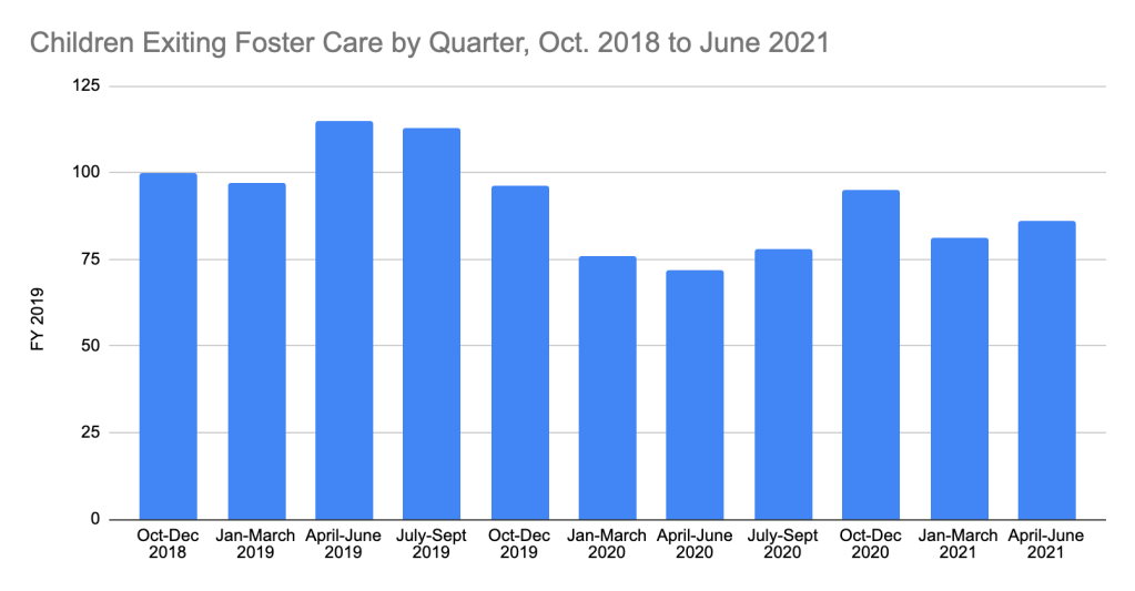 As I have described in earlier posts, there was a big drop in foster care entries before the pandemic, with a surprising increase in entries in the first full pandemic quarter; quarterly entries have remained between 60 and 70 for the last three quarters. Sixty-two children entered foster care in the Spring quarter of 2021, similar to the 64 who entered foster care in the same quarter of FY 2020, as shown in Figure Ten. Figure Eleven shows that while the pandemic seemed to delay foster care exits in its initial stages, that effect seems to have dissipated as the agency and courts adapted to virtual operations. The number of children exiting foster care increased slightly in the Spring quarter of 2021. There were 86 exits from foster care, compared to 62 entries in the March-June quarter resulting in a decrease in the foster care population from 648 children on March 30, 2021 to 624 on June 30.