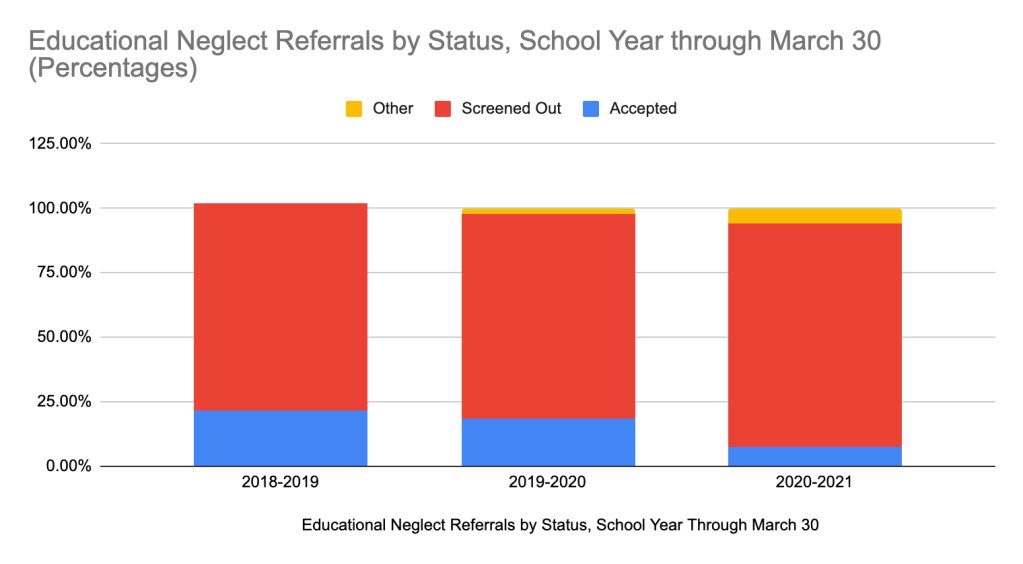 Figure Six shows the percentage of educational neglect referrals that were accepted, screened out and other. CFSA accepted 28.4 percent and screened out 71.6 percent of educational neglect referrals in the pre-pandemic academic year, 2018-2019. In the disrupted School Year (SY) 2019-2020, CFSA accepted 18.6 percent of educational neglect referrals and screened out 81.3%. And in the current academic year as of March 31, 2021, CFSA had accepted only 7.2 percent of educational neglect referrals and screened out 86.9 percent.